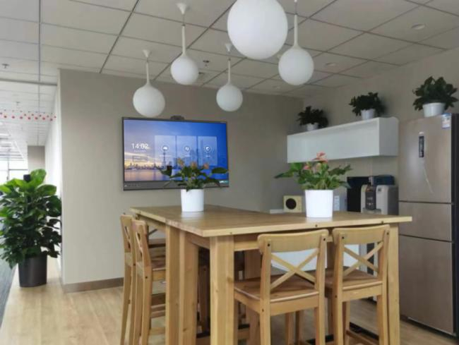 在Newline的开放办公区,一台FLEX Max Pro 分外亮眼,43寸的设计搭配可移动的灵动支架,与灵动办公区设计相得益彰。员工可以在这里利用FLEX开启头脑风暴、小组讨论等场景,同样具备智能的收音降噪功能之外,摄像头的Auto-Framing 能力,能够满足从单人入会到多人入会的多种会议需求,让与会者享受身临其境的会议体验。