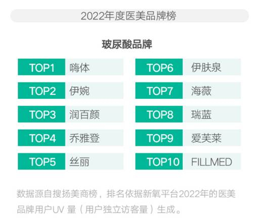 拿2022年玻尿酸品牌榜单“状元”嗨体来说,它是国内唯一药监局批准针对颈部改善的三类医疗器械产品,在国内医美强刚性审核周期下,嗨体在颈部注射填充修复领域根本无竞品。这么多年下来,嗨体已经彻底占据医美消费者心智,“天鹅美颈针”就是“忠实粉”对嗨体的爱称。