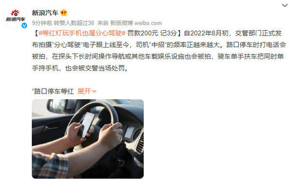 冷知识!等红灯玩手机也属分心驾驶:罚200元 记3分