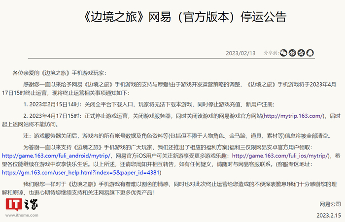 IT之家 2 月 16 日消息,网易《边境之旅》昨日发布停运公告称,由于游戏开发运营策略的调整,《边境之旅》手机游戏将于 2023 年 4 月 17 日 15 时终止运营。