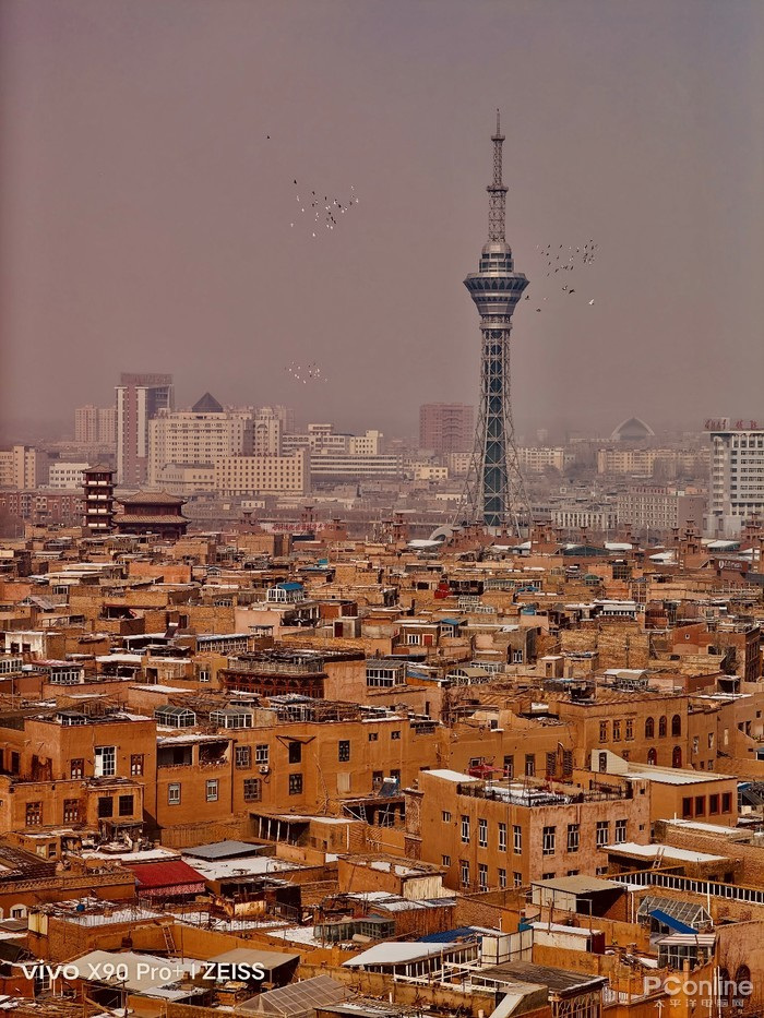 趁着阳光,我们还想尝试俯瞰古城的拍摄,因为整个喀什市区都不允许使用无人机,所以在酒店居高远眺整个喀什古城就成为了必打卡的动作。看着喀什电视塔耸立在古城之中,鸽子在电视塔旁飞来飞去,不得不感慨古城和现代建筑的奇妙结合。