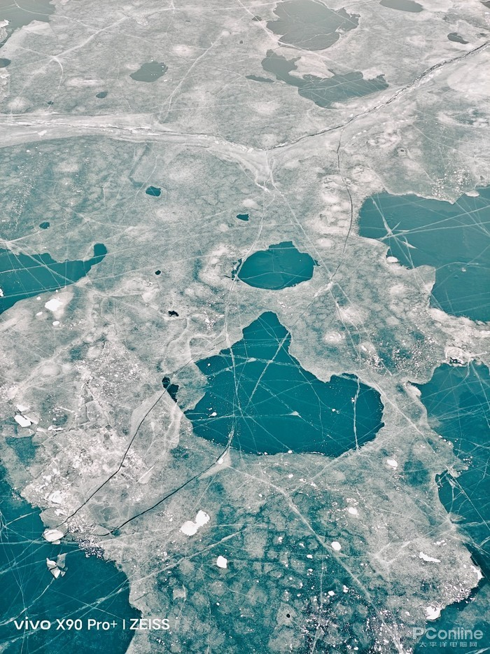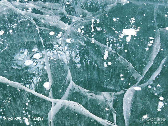 (呈冰裂纹以及冰面大气泡的白沙湖表面)