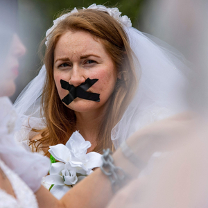 当地时间2021年9月22日,美国波士顿,示威者穿上婚纱抗议童婚。图/视觉中国