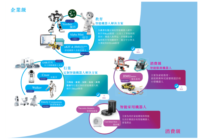 优必选科技以人形机器人全栈技术为主干,生长出人工智能教育、智慧物流、智慧康养等行业的机器人产品及解决方案,以及消费级产品,在部分行业实现大规模商业化。