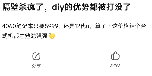 而与此同时,CNMO注意到,这次机械革命4060笔记本开售的冲击,也传导到了装机领域。 不少网友看到了笔记本那边网友们的狂欢与未来可期,又看了看装机市场最近几年的乱象,不禁再度感慨,DIY是否已死?