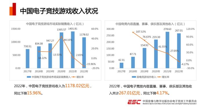 去年电竞游戏收入1178.02亿元,同比下降15.96%。市场整体低迷,用户付费能力和意愿下降为主要原因。