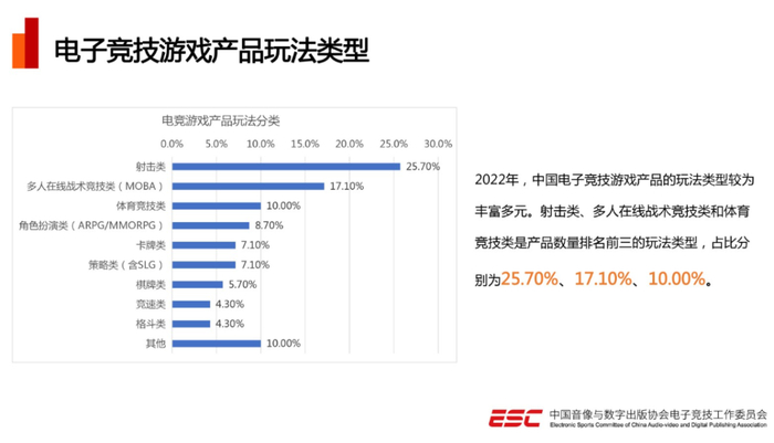 目前我国电竞产品玩法类型较为丰富多元。其中,射击类、多人在线战术竞技类和体育竞技类排名前三,占比分别为25.70%、17.10%、10.00%,其中射击类又是数量最多的玩法类型。