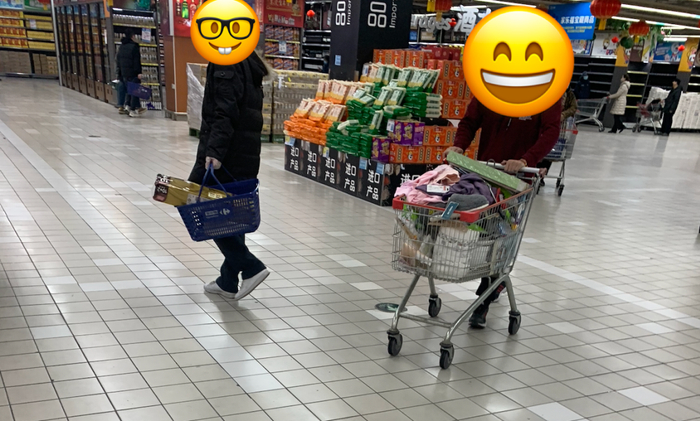 他们几乎人人推车,车车堆满,收银台的队伍排出一整列货架那么长,车里是成箱的牛奶和卷纸打底,锅碗瓢盆和毛巾溜缝儿。