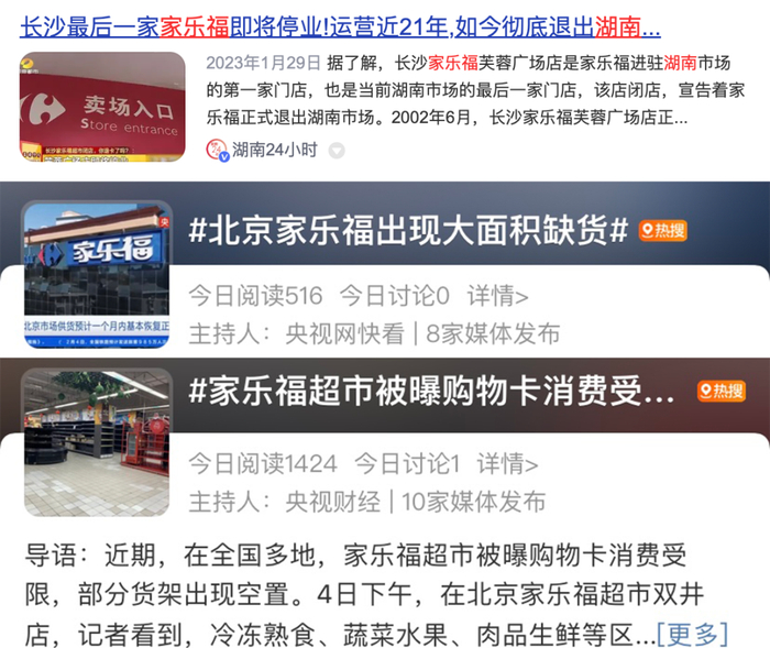 上网一查,我发现全国各地的家乐福正在清空货架。有一些家乐福宣布了闭店,询问“能否退卡”的人蜂拥而至,得到的答案却是“不能退”和“不能说”。