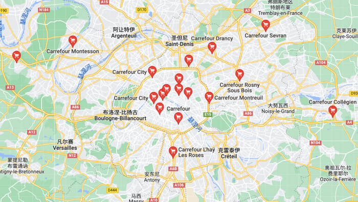 渐渐的,家乐福的选址逐渐向城市中心靠拢,现在我们能从地图上看到,法国大部分家乐福是密集的出现在巴黎这个圆形中的。