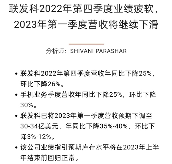 另外像 Counterpoint 等调研机构也指出联发科 2022 年第四季度业绩疲软,今年第一季度营收将继续下滑,就连联发科自己也下调了业绩预期。