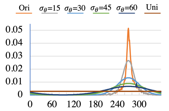二维人体数据集,例如 DeepFashion,通常是为二维视觉任务准备的,因此人体的姿态多样性非常受限。为了量化不平衡的程度,本文统计了 DeepFashion 中模特脸部朝向的频率。如下图所示,橙色的线代表了 DeepFashion 中人脸朝向的分布,可见是极度不平衡的,对于学习三维人体表征造成了困难。为了缓解这一问题,我们提出了由人体姿态指导的采样方式,将分布曲线拉平,如下图中其他颜色的线所示。这可以让训练过程中的模型见到更多样以及更大角度的人体图片,从而帮助三维人体几何的学习。我们对采样参数进行了实验分析,从下面的表格中可见,加上人体姿态指导的采样方式后,虽然图像质量(FID)会有些微下降,但是学出的三维几何(Depth)显著变好。