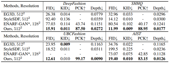 本文在四个大规模人体数据集上进行了实验,分别是 DeepFashion,SHHQ,UBCFashion,AIST。该研究对比了最先进的静态三维物体生成算法 EG3D 与 StyleSDF。同时研究者也比较了专门针对三维人生成的算法 ENARF-GAN。在指标的选择上,本文兼顾渲染质量的评估(FID/KID)、人体控制的准确程度(PCK)以及几何生成的质量(Depth)。如下图所示,本文在所有数据集,所有指标上均大幅超越之前的方案。