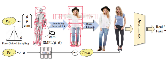 基于提出的高效的人体 NeRF 表达,本文实现了三维人体 GAN 训练框架。在每一次训练迭代中,本文首先从数据集中采样一个 SMPL 的参数以及相机参数,并随机生成一个高斯噪声 z。利用本文提出的人体 NeRF,本文可以将采样出的参数渲染成一张二维人体图片,作为假样本。再利用数据集中的真实样本,本文进行 GAN 的对抗训练。
