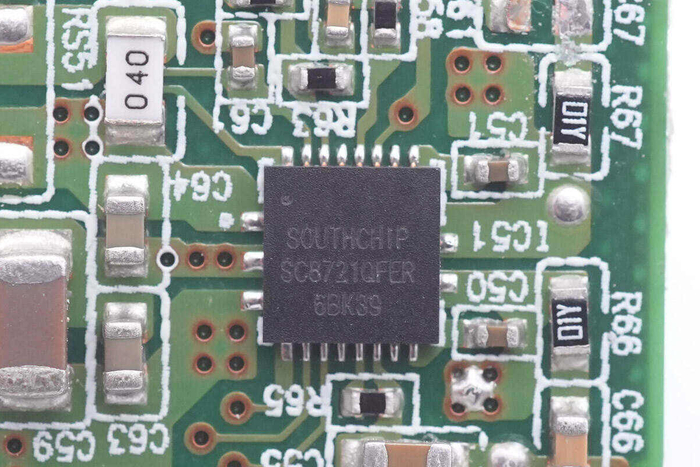 USB-A口同步升降压转换器上的南芯SC8721特写,SC8721采用21pin 4x4 QFN封装,内部集成四管H桥升降压开关管,最大限度简化客户系统设计,减少PCB Space及BOM;高效率能够有效减少热损耗。拥有超宽的输入及输出电压范围,输入输出电压范围均为2.7-22V;支持动态输出电压调整,开关频率可调节,支持输出线补、输出电流监测,支持I2C总线控制的输出电压调节和输出限流调节,内置全面的保护功能。