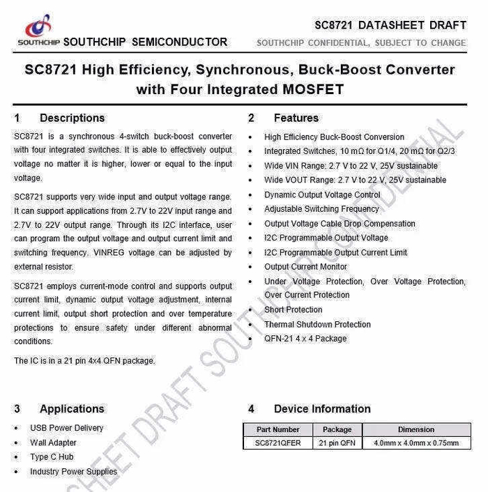 南芯科技SC8721详细资料。根据资料得知南芯SC8721可应用在 USB电源传输、适配器、Type-C hub、工业电压转换的领域中,据充电头网了解到,采用该芯片的产品还有ANKER 25600mAh移动电源、努比亚红魔45W USB PD氘锋移动电源、小米20000mAh移动电源、thinkplus 14000mAh 45W PD快充移动电源等,广受知名厂商的好评与青睐。