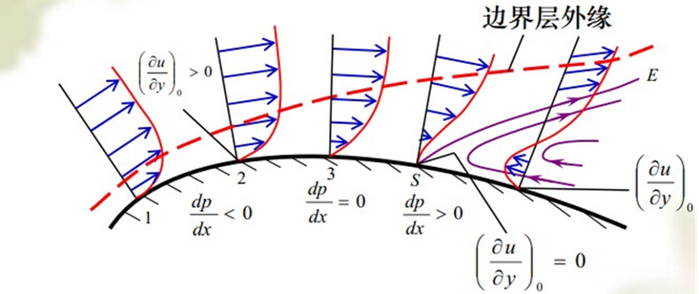 “分离” 指的是 边界层出现脱离表面并回流 的现象。壁面对边界层的 粘性力 和与流动方向相反的 压差阻力 使得在物体某处的边界层发生分离,形成回流区,导致很大的能量耗散。这种分离有一些典型的例子,例如绕流过圆柱、圆球等钝头物体后的流动;角度大的锥形扩散管内的流动等等。当层流边界层在到达分离点前已转变为湍流时,由于湍流的强烈混合效应,分离点会后移。这样虽然增大了摩擦阻力,但压差阻力大为降低,从而减少能量损失。