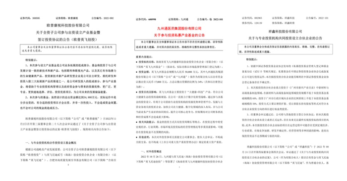 据悉,这3支新设基金分别获得了合肥市、海南自贸港和广州市引导基金的出资,亦有国内知名上市公司欧普康视(300595.SZ)、九州通(600998.SH)和祥鑫科技(002965.SZ)加盟参与。