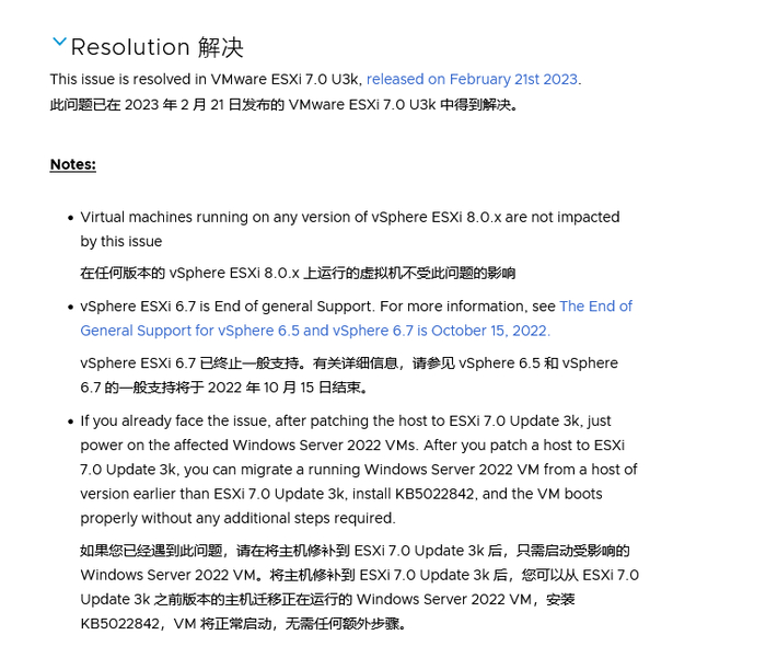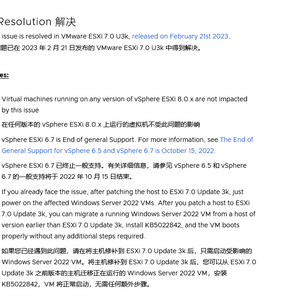 受影响的 Windows Server 2022 虚拟机可以通过升级到 2 月 21 日更新的 VMware ESXi 7.0 U3k 版本,之后可以再次尝试安装 KB5022842,虚拟机同样会正常启动。