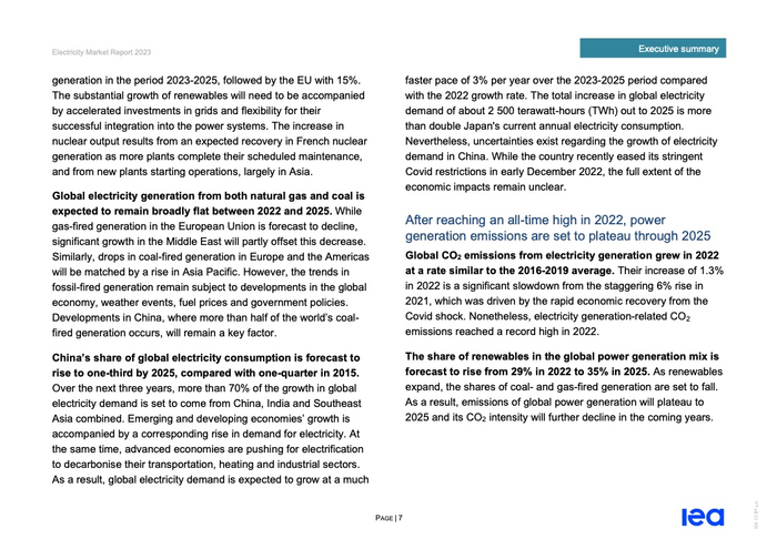 国际能源署对2023—2025年全球电力市场发展情况做出预测。可再生能源和核能将在满足全球电力需求增长方面占主导地位,满足90%以上的增量电力需求。全球天然气发电量和燃煤发电量将大致保持平稳。可再生能源在全球电力结构中的占比将从2022年29%上升到2025年35%。因此,全球与发电相关的碳排放量在2023—2025年间将趋于平稳,并在未来逐步下降。