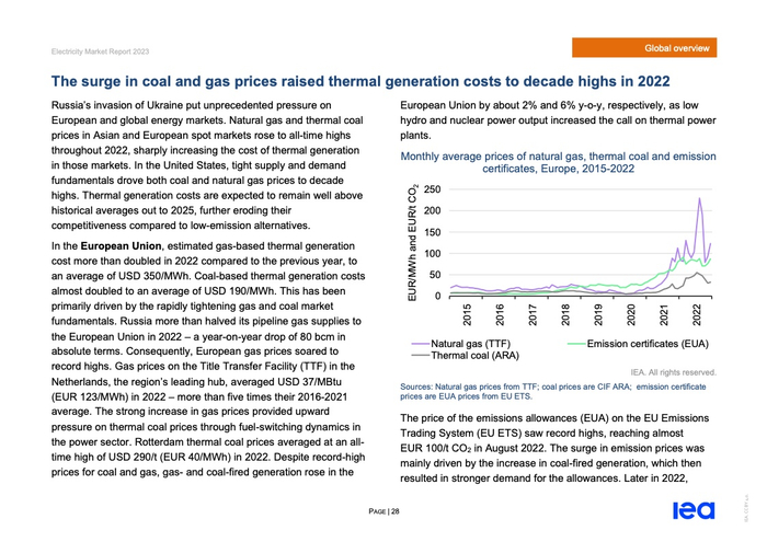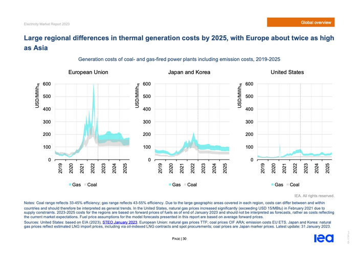 根据国际能源署预测,随着能源价格降低和电气化的进一步推进,欧洲地区电力需求量从2023年开始将以年均1.4%的速度增长。同时国际能源署认为,欧盟目前的碳排放量增长是暂时的,预计到2025年,欧洲的发电相关碳排放量平均每年将减少约10%。随着可再生能源发电量和核发电量的增加,欧洲煤炭和天然气发电量将会大幅下降,降幅分别为年均10%和12%。
