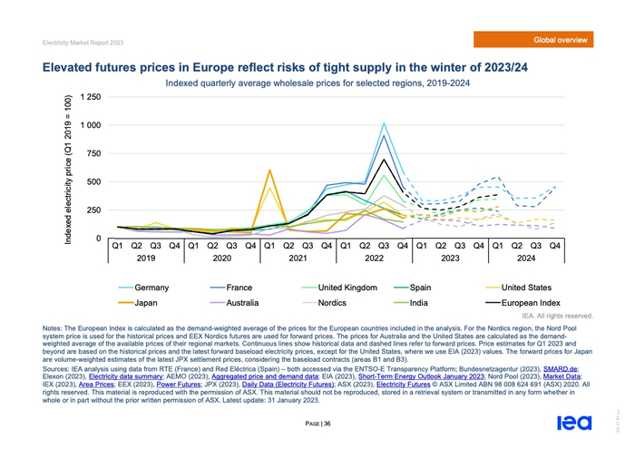 此外,2022年全球电价上涨在欧洲最为明显,同比增长一倍多。2022—2023年欧洲暖冬对抑制电价有所帮助,但与以前相比,欧洲电价仍居高不下。2023—2024年冬季天然气期货价格上涨反映了未来一年欧洲天然气供应的不确定性,仍存在供电紧张的风险。