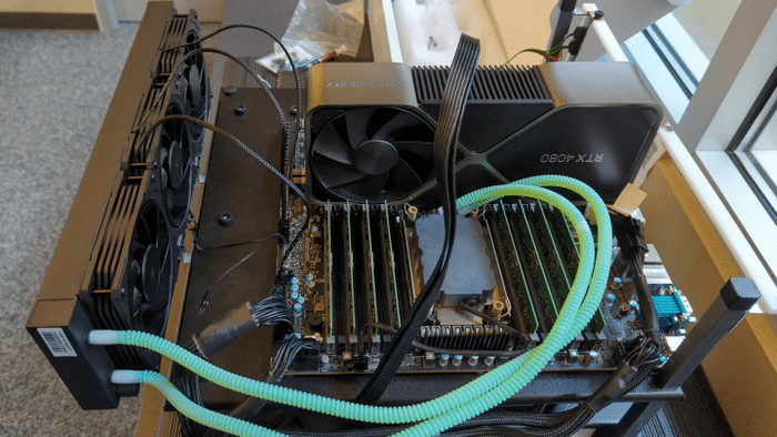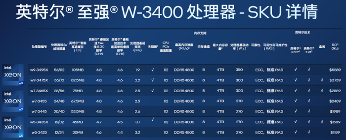 全新的第四代至强W9-3495X处理器,拥有56核心112线程,采用重新设计的内存控制器和更大的L3缓存,与上一代产品相比,单线程和多线程性能分别提升可高达28%和120%。基础频率为1.9GHz,睿频为4.8GHz,默认TDP为350W,售价5889美元(约406576元人民币)。