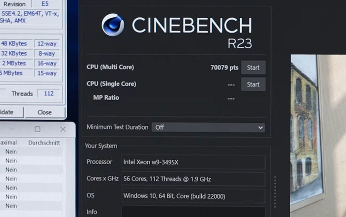 根据海外博主的测试表明,W9-3495X在正常使用时全核可达4.2GHz,瞬间功耗最高突破了1000W,典型功耗则在300W至650W之间。搭配192GB DDR5-5600内存,在GeekBench 5中跑出了单核心1600分、多核心53817分的好成绩。而在全核频率2.9GHz的CineBench R23多核心测试中,跑分达到了70079,突破7万大关,已经接近了AMD目前最强的64核心线程撕裂者5995WX。