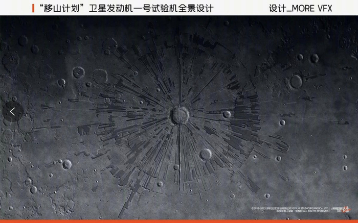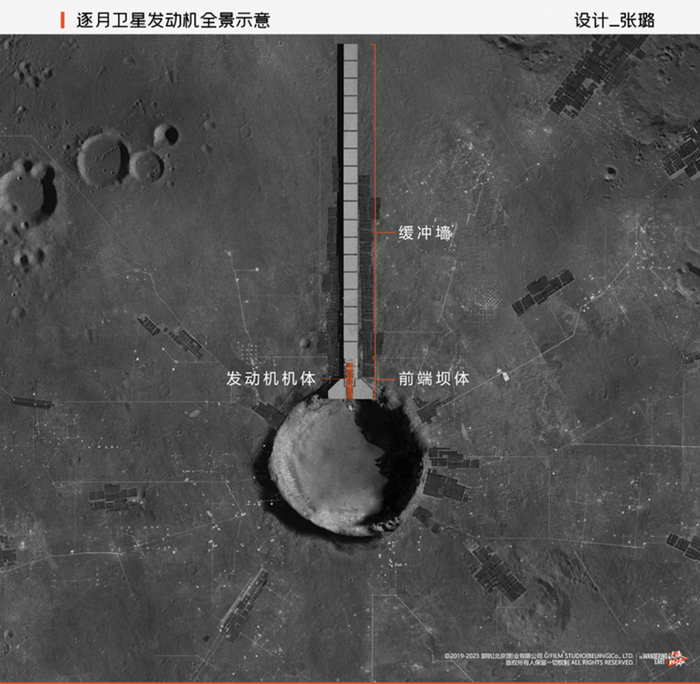 从电影中也能看到环形山的外围放射状的布满了氦 3 原料采集矿坑,而卫星发动机一号试验机(The Moving Mountain Project Planetary Engine〔No.1 Planetary Test Engine〕)则倚靠着环形山内壁。这样灵活的运用环形山结构的设计使发动机结构与月球表面嵌合,以保证最大的推进功率。发动机由前端坝体、发动机机体、缓冲墙三部分组成,绵延数十公里,喷口正向坎帕努斯环形山山口,主喷口和次喷口总计 11 个,呈横向对称式排列;修造发动机的机器人留下的材料挖掘矩形痕迹可从月球轨道上清晰观测。可行性验证后更名为逐月一号发动机(Lunar 1 Staellite Enigine),最终于 2058 年“月球坠落危机”中受 MOSS 控制过载爆炸,成为危机的开端。