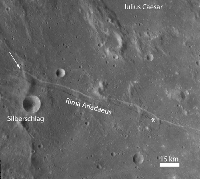 3. Mountain Rima Ariadaeus:位于月球赤道地区,是一个非常独特的线性沟。一些科学家认为,线状细沟可能是在大型撞击事件后形成的,而另一些科学家则认为,细沟是在月球仍处于火山活动状态时,作为深层堤防系统的表面表现而形成的。甚至有少数学者认为这证明了:月球是由两个小星体合二为一而形成的…… 总之,独特的线性结构给了科学家很多想象的空间。