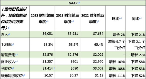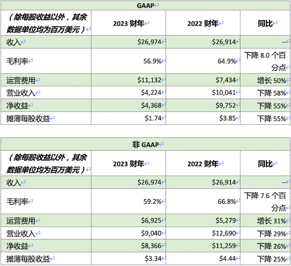2023 财年总收入达到 269.7 亿美元,与去年同期持平。全年 GAAP 摊薄每股收益为 1.74 美元,较上一财年下降 55%。全年非 GAAP 摊薄每股收益为 3.34 美元,较上一财年下降 25%。