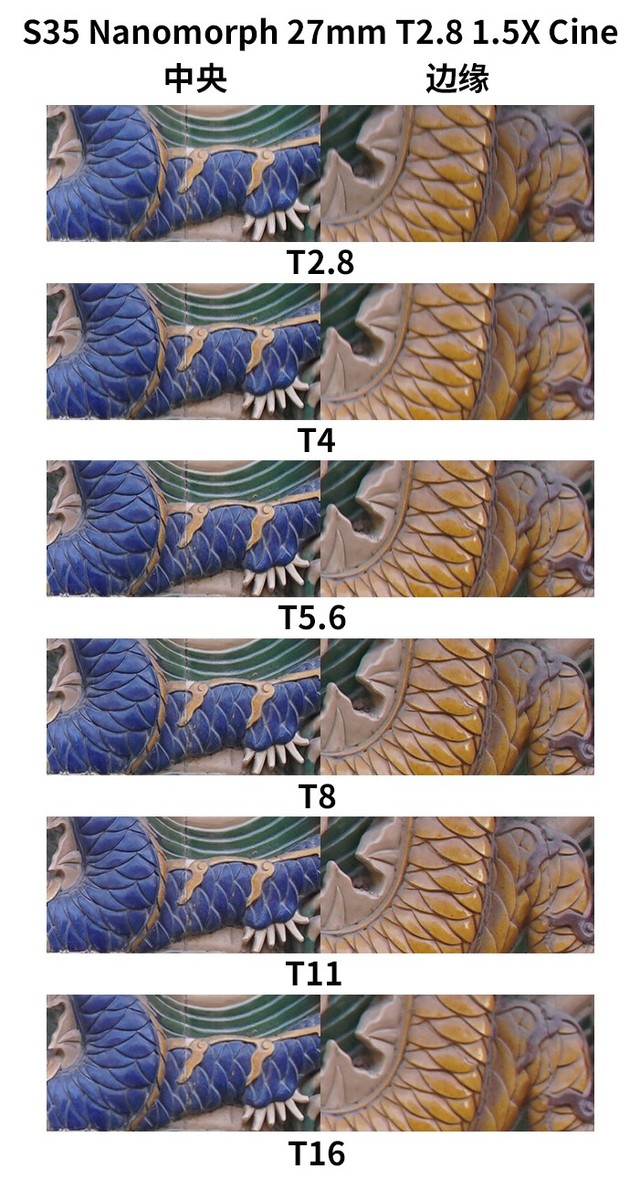 S35 Nanomorph 27mm T2.8 1.5X Cine这枚镜头在光圈全开的情况下,画面中央的分辨率表现就已经非常优秀了。而在T4—T8光圈下,中央分辨率表现最为优秀。即使在T11、T16这两档小光圈下,分辨率表现也是可圈可点的。画面边缘位置的分辨率表现也还是非常优秀的,仅在最大光圈下稍有些松散。