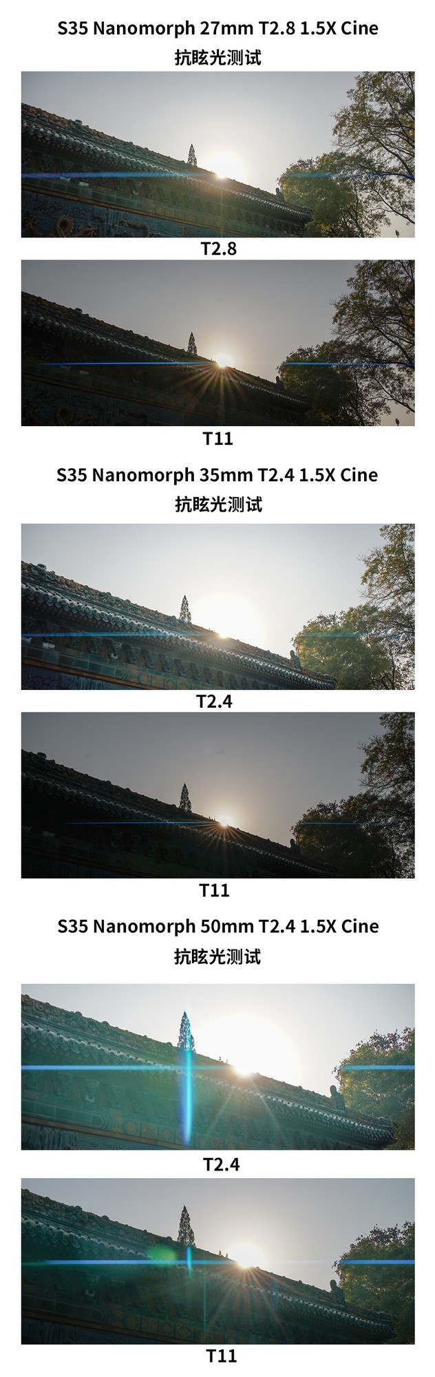 前面我们介绍过,老蛙这三枚镜头拥有变形宽荧幕镜头特有的眩光拉丝特效,蓝色拉丝为画面增添了一抹亮色。但除了眩光拉丝特效以外,在鬼影和其他杂乱眩光的抑制方面,三枚镜头的表现都很出色。最大光圈和较小光圈下,都没有出现明显影响画面的鬼影和杂乱眩光。在T11光圈下,三枚镜头都产生了非常好看的星芒特效,为整体画面增色不少。