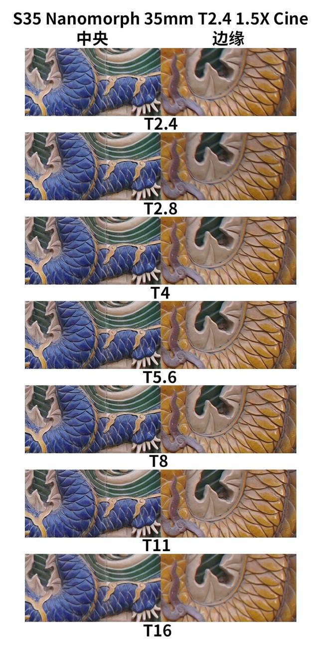 S35 Nanomorph 35mm T2.4 1.5X Cine在分辨率上的表现和上面的27mm镜头类似。整体分辨率表现非常的优秀。中心位置光圈全开情况下也非常的锐利,边缘的表现也是可圈可点。