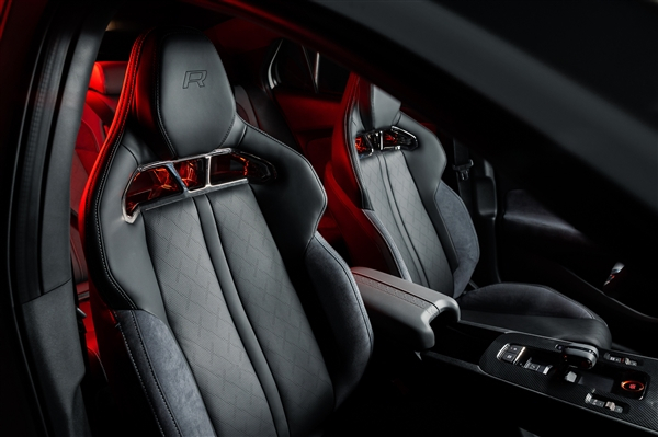 车外则配有熏黑轮毂、橙色卡钳、黑色尾翼、夸张的扩散器以及前后红色“R”标等设计,让整车外观更加运动。
