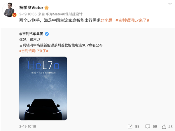 有一个有意思的巧合,“东半球最好”吉利几何A的发布会,恰巧与“五百万内最好”SUV的老前辈,理想one的上市发布会仅差一天。而这次银河L7,也与理想L7撞了名字。吉利集团高级副总裁杨学良在微博上发了一句“两个L7联手,满足中国主流家庭智能出行需求”并@理想汽车创始人李想。不过李想并未在微博上正式回复。