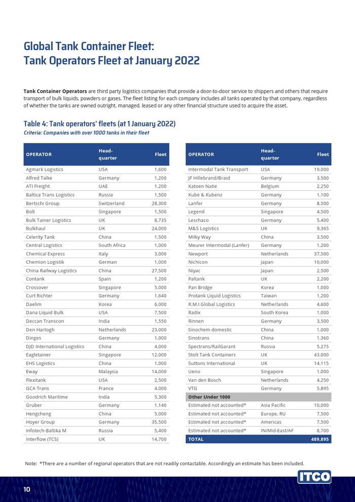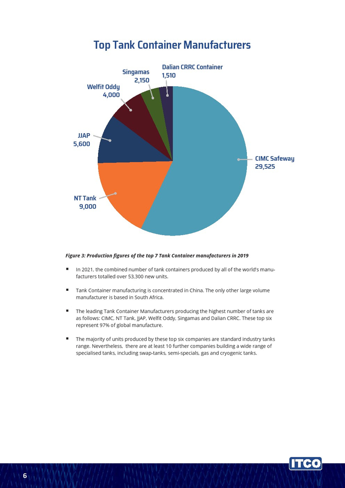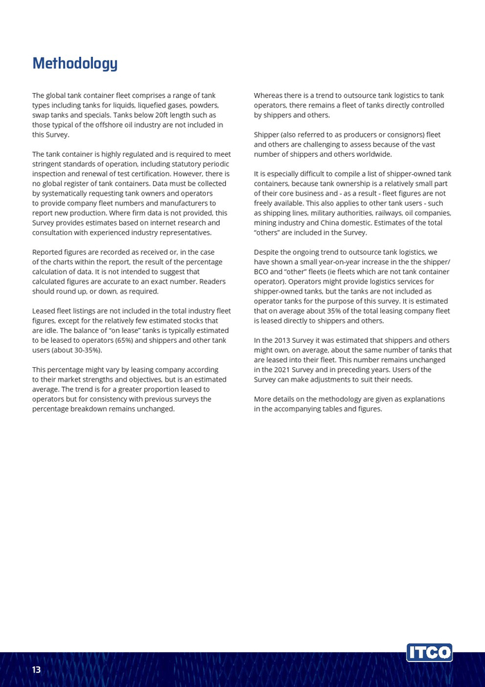 与以前的版本一样,本调查旨在逐年分析世界罐式集装箱船队的增长和罐式集装箱制造的发展。从数字上看,该行业如何在全球范围内继续由数量相对较少的主要罐式集装箱运营商和租赁公司主导。