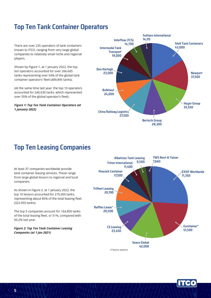 排名前10位的罐式集装箱运营商拥有超过266665个储罐,约占全球罐式集装箱运营商船队的60%。排名前10位的租赁公司共拥有275050个储罐,约占总租赁量的85%。