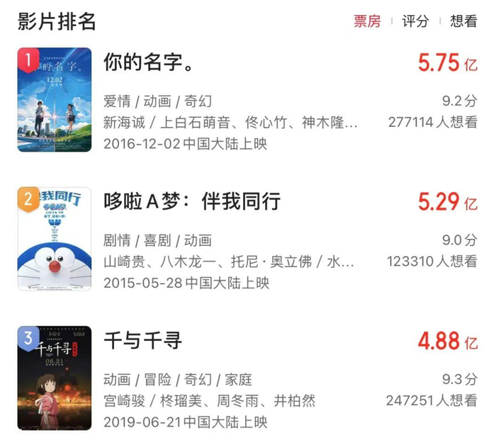 和好莱坞引进片不一样,日影在内地向来是小众的代名词,只有极少数项目能够打破核心受众圈层进入大众市场。因此可以看到,自从2016年贺岁档上映的新海诚动画电影《你的名字。》以5.75亿元刷新内地票房新高以来,六年多过去了,还是没有影片能打破这一纪录。