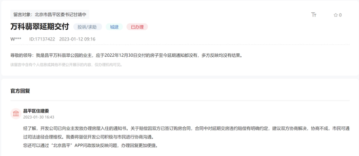 事实上,万科旗下因延期交付遭遇投诉的项目并不少。据不完全统计,2022年,太原市万科春和景明2期项目、北京市丰台区万科翡翠西湖项目、秦皇岛万科未来城二期等项目延期交付问题投诉信息多次出现在人民网领导留言板上。