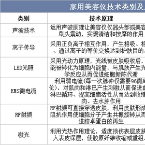 家用美容仪是指利用物理、电子技术、光学等科学原理对人体生理机能和表面肌肤进行调节和改善的机器;按照美容仪所使用的技术可以将其分类为声波技术、离子传导、LED光、EMS微电流等6类。