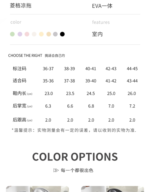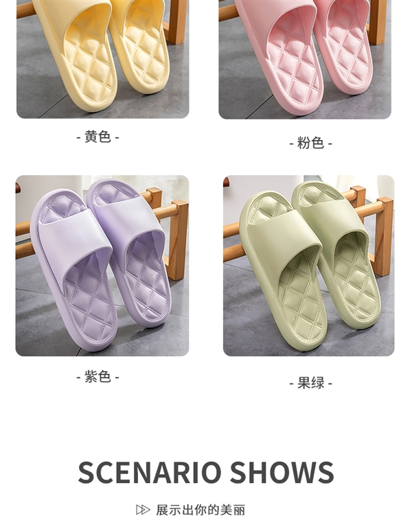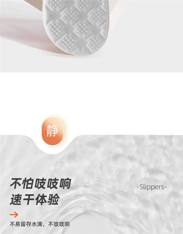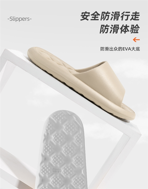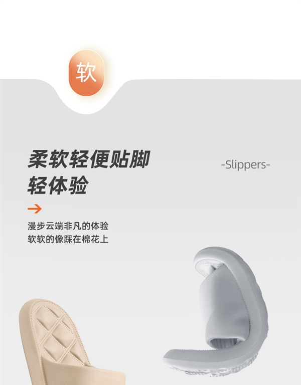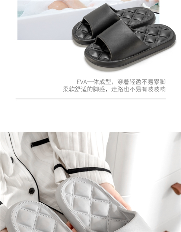 EVA一体成型,穿着轻盈不易累脚,脚感柔软舒适,走路也不易有吱吱响,软软的像踩在棉花上。