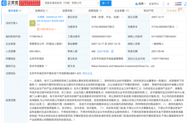 企查查APP显示,诺基亚通信投资(中国)有限公司成立于2007年。该公司的法定代表人为马博策,注册资本3.18亿欧元(折合人民币约23.36亿元),由诺基亚通信有限公司全资控股。该公司对外投资企业共9家,目前仅4家为存续状态,其间接持股企业共20家,包括上海诺基亚贝尔股份有限公司、诺基亚通信系统技术(北京)有限公司等。