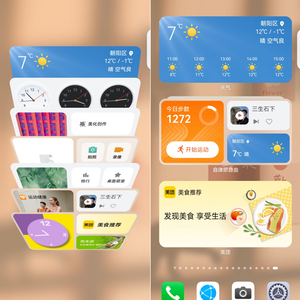 另外,不同尺寸的卡片、系统按钮、快捷方式也能相互组合,比如将运动健康、天气和音乐卡片组合在一起后,我在户外跑步时就可以一边听歌一边查看步数,同时还能关注天气实时变化,所有服务一步直达,桌面易用性玩出新高度。
