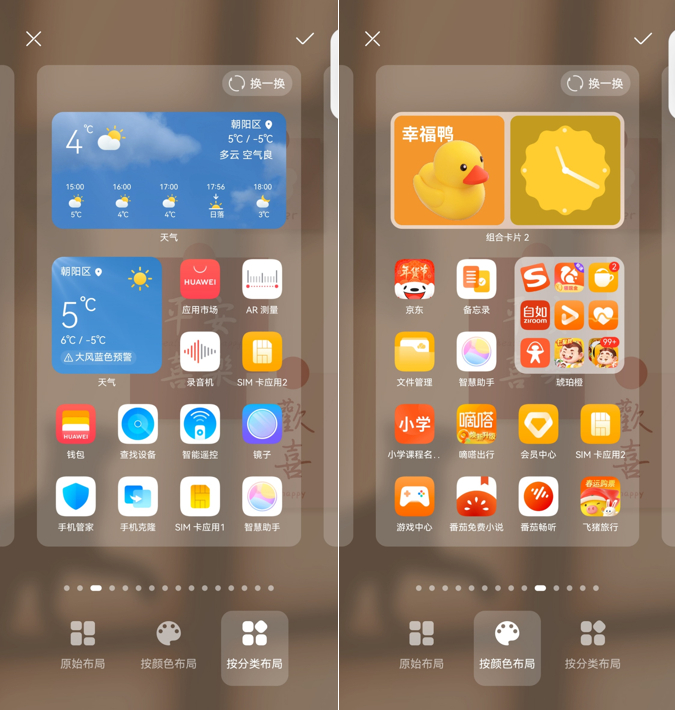 首先来看智能桌面布局,通过双指捏合进入桌面编辑模式,选择“布局”就可以看到原始布局、按颜色布局以及按分类布局三个选项。顾名思义,按颜色布局系统就会将所有应用和卡片按照不同的颜色进行自动分类,同色系的应用和卡片会放置在同一屏内,文艺范儿十足。通过功能分类,桌面内的所有应用和卡片就会生活、社交、美食、出行等不同类别进行排布,布局更有条理。
