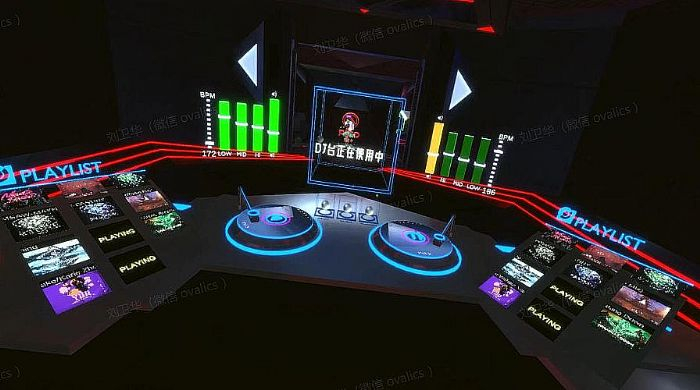 作为全场的C位焦点,虚拟DJ台可以说是整场电音演出的核心,在演出结束后开放的互动休闲区中,用户可以亲自操刀DJ台。在虚拟DJ台上,用户可以化身嗨动全场的资深DJ,通过眼前虚拟DJ台上的调音、Remix、声效设置,体验一把当现场DJ的快乐!