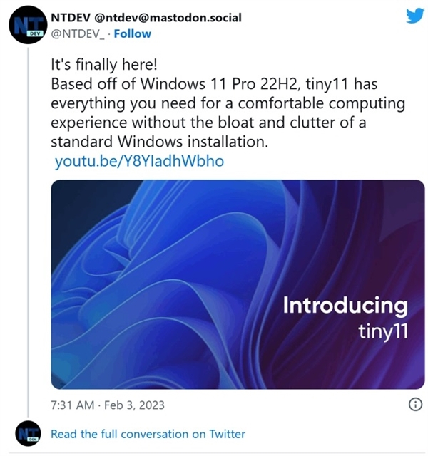 Tiny11就是一款针对Windows 11的系统精简工具,开发者是海外网友NTDEV,通过删除不必要的库、应用、服务,只需2GB内存、12GB硬盘空间就可以流畅运行,也不需要TPM。
