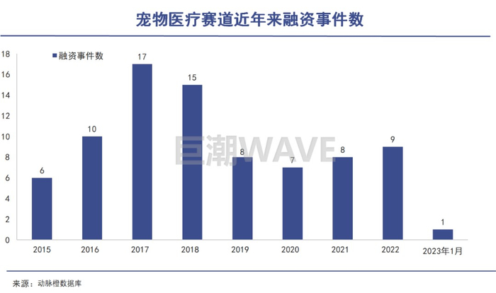 据机构动脉橙数据库统计,从2015年到2023年1月31日,我国宠物医疗赛道共计发生81起融资事件,投资金额高达百亿,覆盖的领域也从医疗机构、医疗保险、医疗器械到宠物医生教育等全面开花。