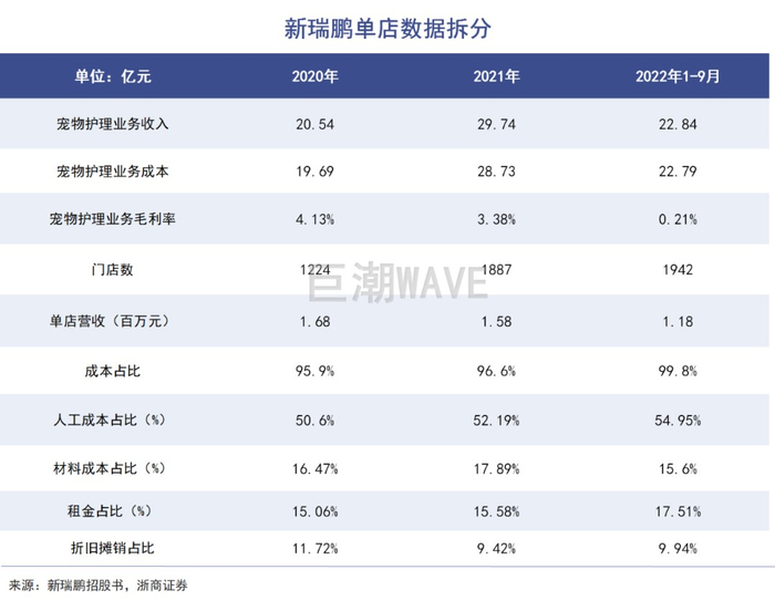 前后巨大的毛利率差异主要来自于近几年人力成本的变化,尤其是兽医的人力成本。数据显示,2020年至2022年前三季度,新瑞鹏成本结构中的人力成本占比分别高达50.6%、52.19%和54.95%。