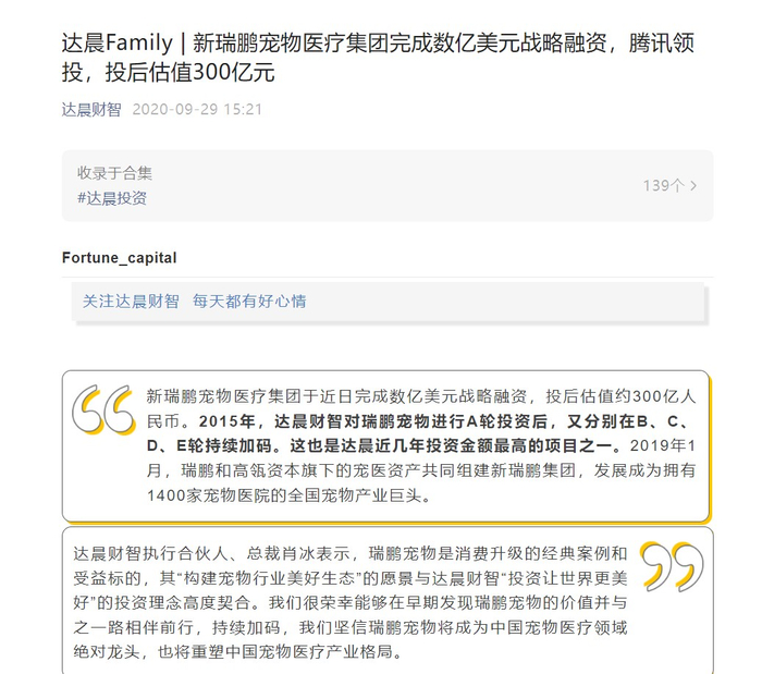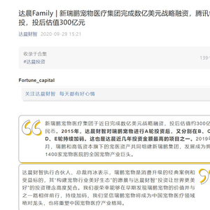 紧随新瑞鹏脚步,瑞派宠物也已先后获得瑞普生物、高盛、华泰新产业基金、越秀产业基金、玛氏集团、蒙牛创投等产业投资方的投资。据公开消息,瑞派宠物现估值已增至约120亿元,旗下宠物医院数量已超500家,也于去年传出赴港上市的消息。